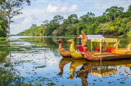 Après votre petit-déjeuner, vous faites route vers le Tonle Sap pour une promenade en barque au fil de l'eau. Ce lac est le plus étendu d'Asie du Sud-Est, il est situé à 10 km de Siem Reap. Sa superficie varie tout au long de l'année et sa crue annuelle règle la vie du peuple khmer. Cette véritable mer intérieure a été classée « Réserve de Biosphère » par l'Unesco en 1997 en raison de l'incroyable diversité de son écosystème. Sur les rives du Tonle Sap, vous découvrirez les villages flottants dont les maisons sont construites sur pilotis. Retour à Siem Reap pour un déjeuner libre dans un restaurant local.
