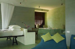 La chambre n°12 mesure 35 m2 et se situe au rez-de-chaussée de la « Red Villa ». Offrant une vue sur la piscine, la chambre comprend un petit coin repos et une grande salle de bains.