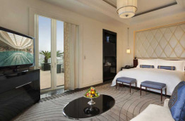 The Palace Suite mesure 306 m2. Une terrasse de 1 000 m2 entoure la suite et offre une vue imprenable sur Shanghai. Son salon bénéficie de grandes hauteurs sous plafond et est équipé d'un piano.