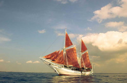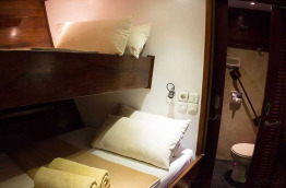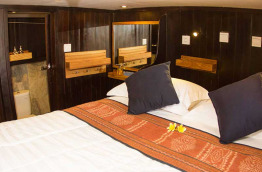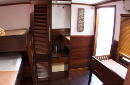 Ce bateau a été construit en 1995 à Kalimantan sur le format d’un « phinisi », un voilier traditionnel indonésien à 2 mâts se caractérisant par une forme élancée. Le Katharina mesure 40 m de long et possède 6 cabines confortables situées sur le pont inférieur. Elles peuvent accueillir jusqu’à 14 passagers et comptent 2 cabines équipées d’un lit double, 2 cabines équipées de lits jumeaux superposés et 3 cabines équipées d’un lit double et d’un lit simple superposé. Le Katharina présente également un pont supérieur avec solarium et un pont principal composé d’une salle à manger extérieure, d’un bar et d’un espace détente. Toutes les cabines disposent de l’air conditionné, d’une salle de bains privée avec toilettes et douche, d’un coffre-fort et d’un espace de rangement. Elles sont élégantes, chaleureuses, aménagées avec du mobilier en bois et décorées selon le style traditionnel local. L’équipage se compose de 13 membres. Un téléviseur ainsi qu’une sélection de DVD et une chaîne Hi-Fi sont à votre disposition dans le « lounge ». Les serviettes de toilette et de plage sont mises à votre disposition à bord.
