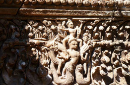 Avant votre réveil, le bateau commence sa navigation vers le Nord. Vous êtes conviés à prendre votre petit-déjeuner sur le pont en observant les rives du Mékong qui défilent devant vos yeux. Le Vat Phou prend la direction de Ban Duata. Vous débarquez pour une petite promenade entre les maisons traditionnelles du village, puis retour à bord pour poursuivre votre remontée du Mékong. Déjeuner à bord du Vat Phou. Votre embarcation accède à la rive Est du fleuve aux environs du village de Huei Thamo. Vous rejoignez la terre ferme à nouveau et marchez à travers la forêt pour accéder à un site reculé, le temple de Um Muang. Cet ancien temple khmer n'a pas connu de rénovation et la végétation commence à prendre le pas sur les bas-reliefs et les murs effondrés de cet ancien lieu culte. Um Muang était situé sur la route des temples d'Angkor, il possédait une importance particulière pour la population khmère. Certaines portes, quelques couloirs et plusieurs sculptures ont subsisté à l'épreuve du temps. Si le site mérite aujourd'hui beaucoup d'attention pour retrouver son aspect originel, il n'en reste pas moins un lieu mystérieux situé au cœur d'une forêt d'une grande beauté. Retour à pied vers votre embarcation, temps libre pour vous reposer. Dîner et nuit en cabine twin.