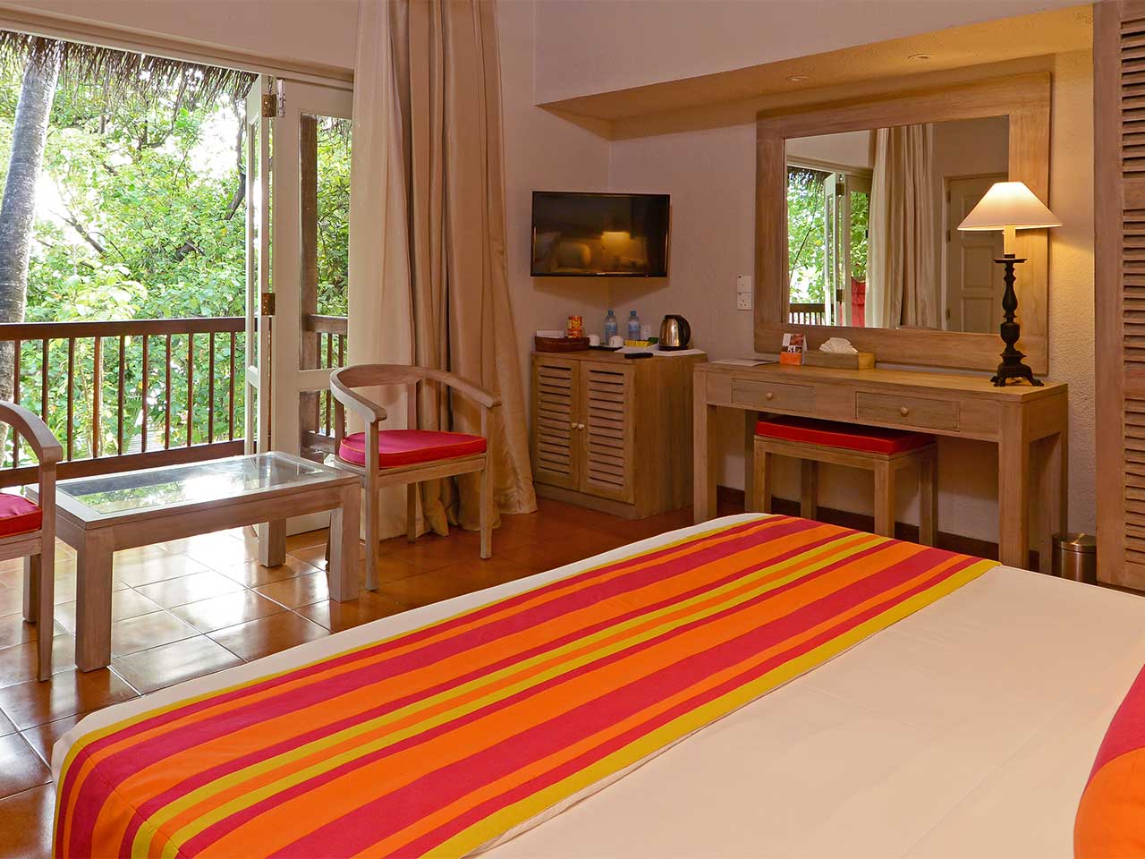 Adaaran Club Rannalhi compte 122 chambres réparties autour de l’île et sur pilotis. Elles ont toutes été rénovées dans des tons de bois et des couleurs axées sur le blanc et le pastel. Toutes sont équipées de l’air conditionné, de l’accès internet Wi-Fi, d’un nécessaire à thé et café, d’une salle de bains avec douche, d’un sèche-cheveux, d’une terrasse ou d’un balcon, d’un minibar, d’un coffre-fort, d’un téléphone et d’une télévision.