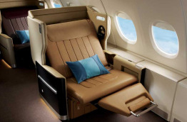 Classe affaire long courrier : Les sièges sont en cuir de 86 cm de largeur et inclinables à l’horizontal, pour se transformer en lit. Des espaces ont été aménagés pour poser vos bagages de cabines à portée de main.