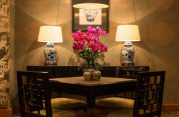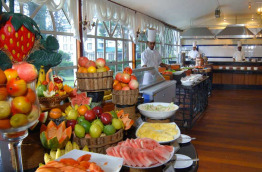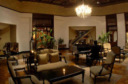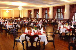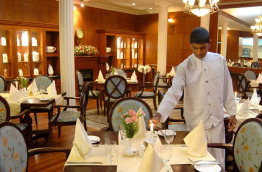 La salle de réception, d’inspiration coloniale elle aussi, est située en rez-de-jardin. Ainsi on peut admirer les fleurs et les arbres qui entourent l’hôtel, tout en consommant son repas. Enfin, si la météo le permet il est possible de se restaurer en extérieur, sur la pelouse anglaise de l’hôtel.