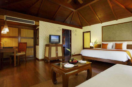 Villa Deluxe Executive : chambre de 140 m2 avec téléviseur LCD, lecteur DVD, salle multimédia, grande salle de bains avec baignoire en pierre, petite piscine privée à l'abri des regards indiscrets, deuxième salle de bains avec douche et toilettes, vue sur la piscine privée.