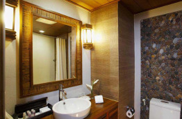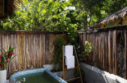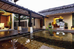 Villa Deluxe de 76 m? avec TV LCD, lecteur DVD, espace salon, immense salle de bains avec baignoire en pierre, douche séparée avec effet de pluie et petite piscine privée entourée d'un mur décoratif, vue sur la piscine privée.