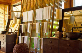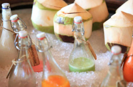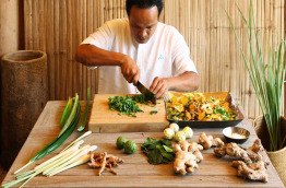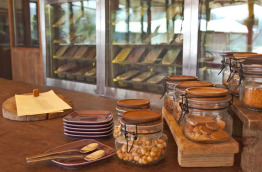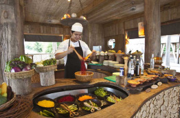Le Dining Room est installé au-dessus des rochers, parmi les arbres tropicaux. Sa carte suggère des plats thaïlandais et méditerranéens. Un buffet présente les ingrédients qu’il est possible de faire cuire soi-même, dans un four en pierre.